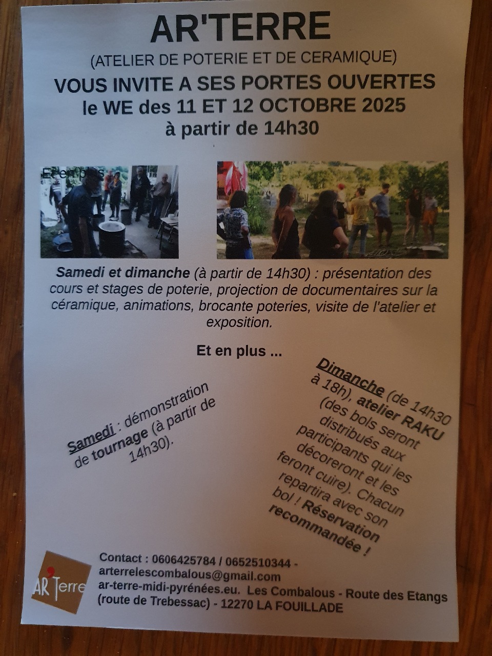 Vous pouvez consulter notre nouvelle page facebook et nous contacter par messenger ou facebook. Adresse: AR'Terre - Atelier de Céramique Les Combalous